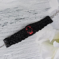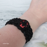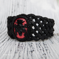 Браслет из кожи, плетеный. Украшен камеей из полимерной глины с изображением черепа в шляпе и пистолетов.