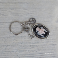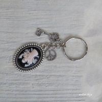 Брелок для ключей на кольце с подвеской-камеей с изображением черепа в шляпе, подвеской ключиком и символом мира.