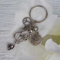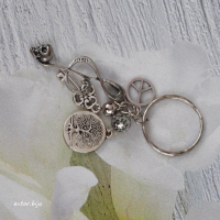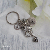 Брелок для ключей на кольце с несколькими подвесками из металла: скрипичный ключ, ключик, дерево жизни, мир.