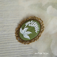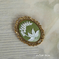 Брошь с вставкой-камеей из полимерной глины с изображением ландыша