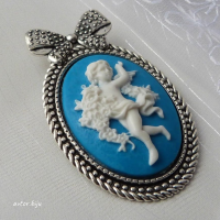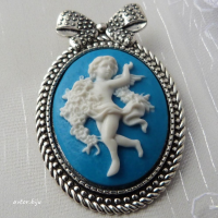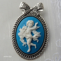 Брошь с вставкой-камеей из полимерной глины с изображением бегущего ангела и цветов