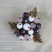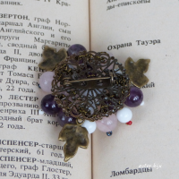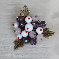 Брошь с бусинами натурального аметиста, агата и розового кварца, растительной тематики.