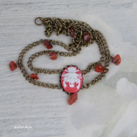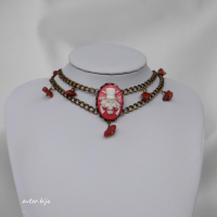 Чокер из двух цепочек с камеей с изображением черепа в шляпе и подвесками из сердолика