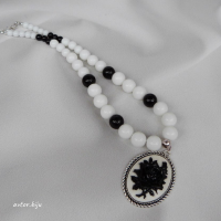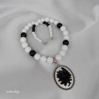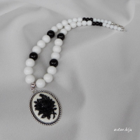 Колье из бусин натурального агата белого и черного цвета, с подвеской-камеей (черная роза на белом фоне)