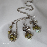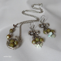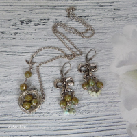 Кулон с подвеской из чешских бусин, оплетенных в форме птичьего гнезда и птичкой