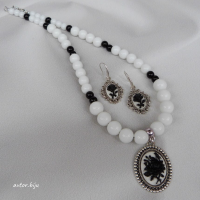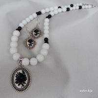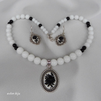 Колье из бусин натурального агата белого и черного цвета, с подвеской-камеей (черная роза на белом фоне)