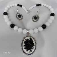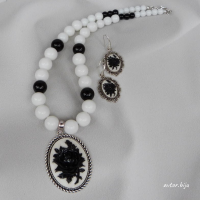 Колье из бусин натурального агата белого и черного цвета, с подвеской-камеей (черная роза на белом фоне)