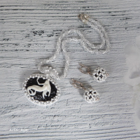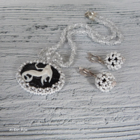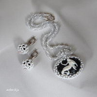 Колье из бисера двух цветов: белого и серебристого; плетеное, с подвеской-камеей из полимерной глины (русалка).