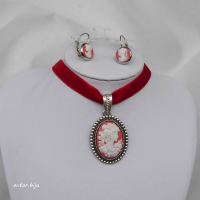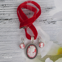 Комплект украшений с камеями (чокер и серьги 10 мм) девушка, фон - розовый