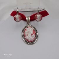 Подвеска-камея из полимерной глины с изображением женского профиля на алой бархатной ленте
