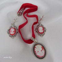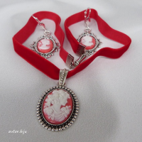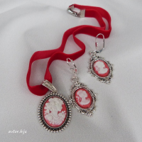 Комплект украшений с камеями (чокер и серьги) девушка, фон - розовый