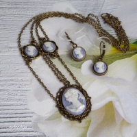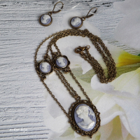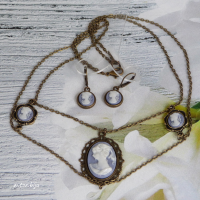 Комплект украшений с камеями (колье и серьги) девушка, фон - сиреневый.