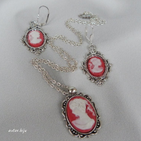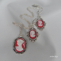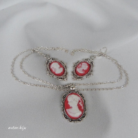 Комплект украшений с камеями (кулон и серьги) девушка, фон - розовый