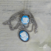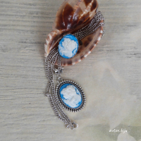 Кулон-камея из полимерной глины с изображением двух женских профилей, цвет фона - голубой