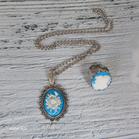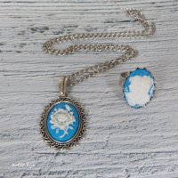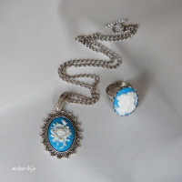 Кулон-камея из полимерной глины с изображением розы, цвет фона - голубой