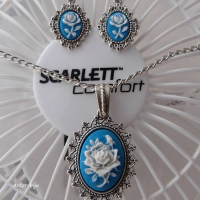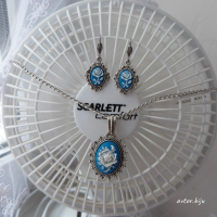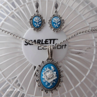 Комплект украшений с камеями Роза (кулон-серьги) фон - голубой под серебро