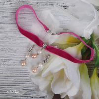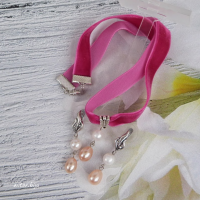 Подвеска из розового и белого жемчуга на малиновой бархатной ленте