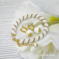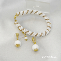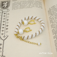 Браслет из бисерного жгута, двухцветный: белый, золотистый. С подвеской - бусиной белого агата.