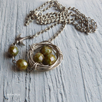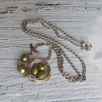 Кулон с подвеской из чешских бусин, оплетенных в форме птичьего гнезда и птичкой