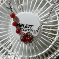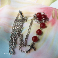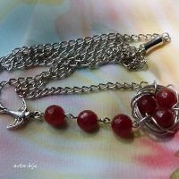 Кулон с подвеской из бусин тонированного кварца, оплетенных в форме птичьего гнезда и птичкой