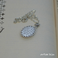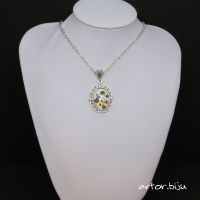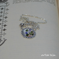 Кулон с подвеской - стеклянным кабошоном с нанесенным рисунком цветка ириса.