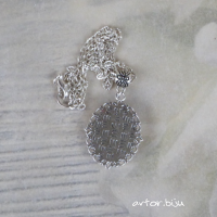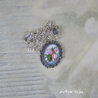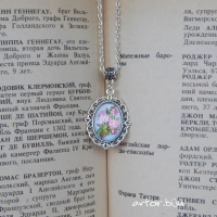 Кулон с подвеской - стеклянным кабошоном с нанесенным рисунком розочки. Цвет - голубой, розовый, серебристый Размер подвески - 3 см Размер - 35 см Замок - карабин Вес - 7 г Металл - латунь под античное серебро Материалы - стекло, металл Вставка - стеклянный кабошон