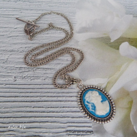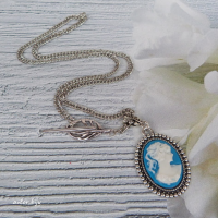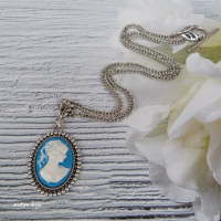 Кулон-камея из полимерной глины с изображением женского профиля, цвет фона - голубой