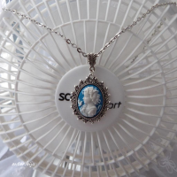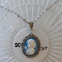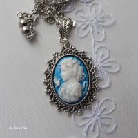 Кулон-камея из полимерной глины с изображением женского профиля с птичкой, цвет фона - голубой