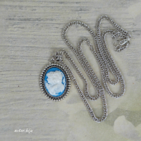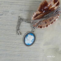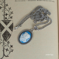 Кулон-камея из полимерной глины с изображением двух женских профилей, цвет фона - голубой