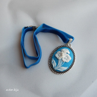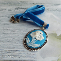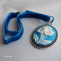 Подвеска-камея из полимерной глины с изображением цветов на голубой бархатной ленте