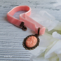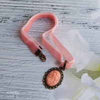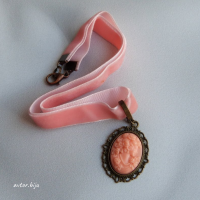 Подвеска-камея из полимерной глины с изображением женского профиля на розовой бархатной ленте