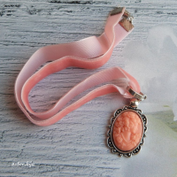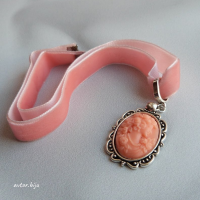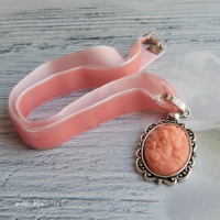 Подвеска-камея из полимерной глины с изображением женского профиля на розовой бархатной ленте