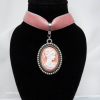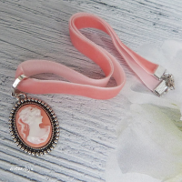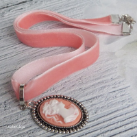Подвеска-камея из полимерной глины с изображением женского профиля на розовой бархатной ленте