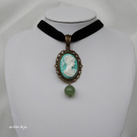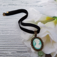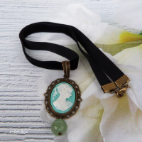 Подвеска-камея из полимерной глины с изображением женского профиля на черной бархатной ленте