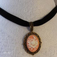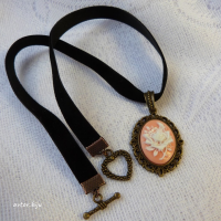 Подвеска-камея из полимерной глины с изображением розы на черной бархатной ленте