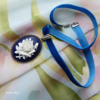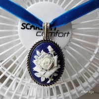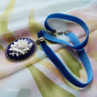 Подвеска-камея из полимерной глины с изображением розы на синей бархатной ленте