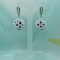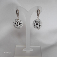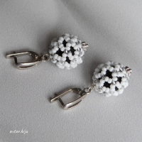 Серьги с натуральным агатом черного цвета, оплетенным бисером (белым и серебристым). Оплетение ажурное, не скрывает натуральный камень.
