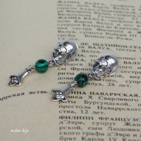 Серьги с черепом, бусиной малахита и подвеской в форме лилии.